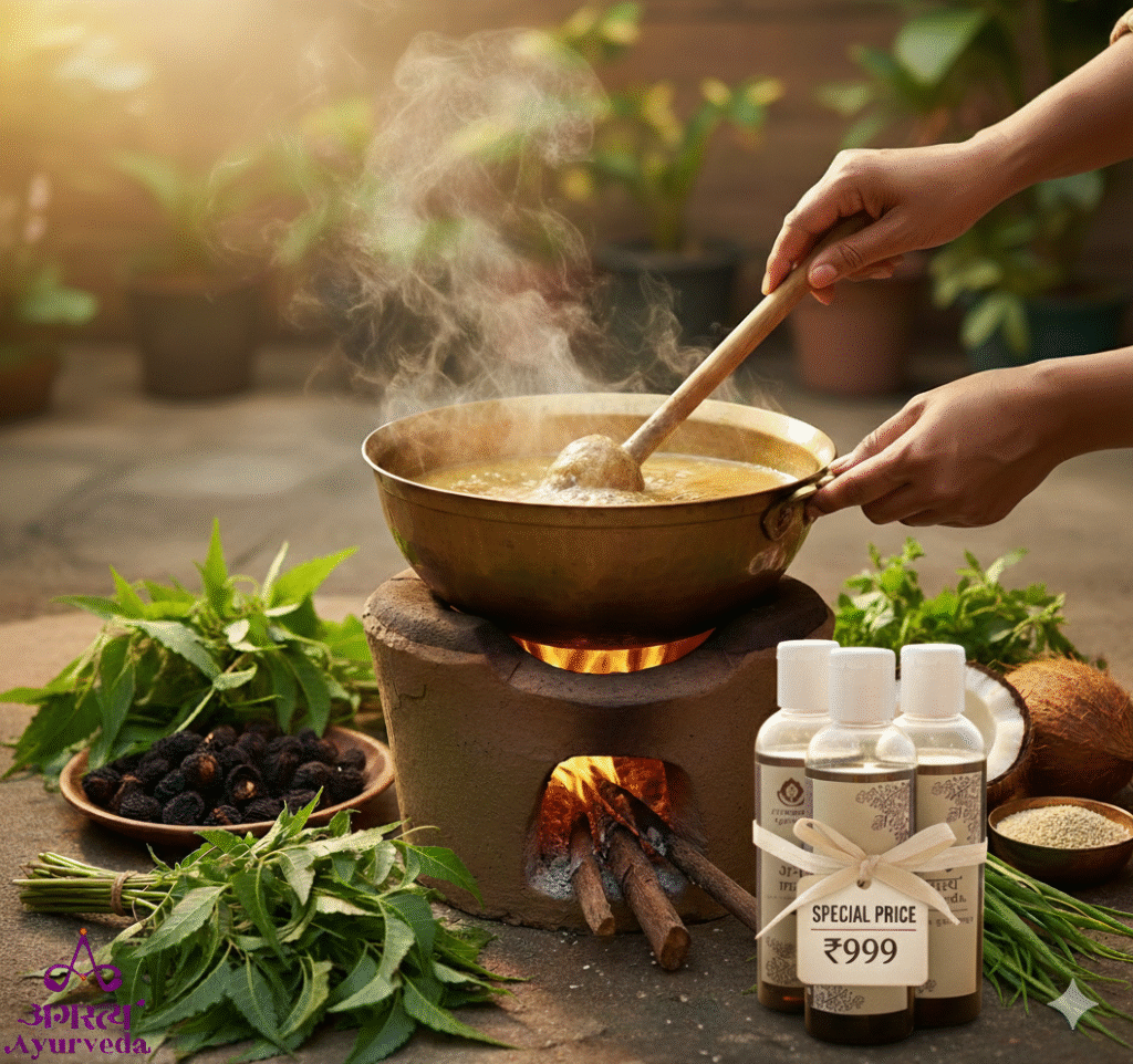 Founded after studying the classical Taila-Pāka Vidhi and meeting traditional practitioners, the brand crafts its entire range—including hair care, skin care, and Śāstrokt medicine—with handpicked, preservative-free herbs. Guided by the principle of purity and the timeless prayer,
