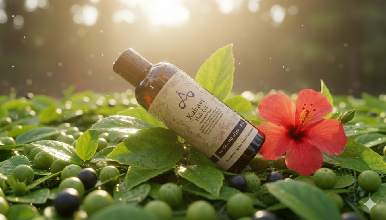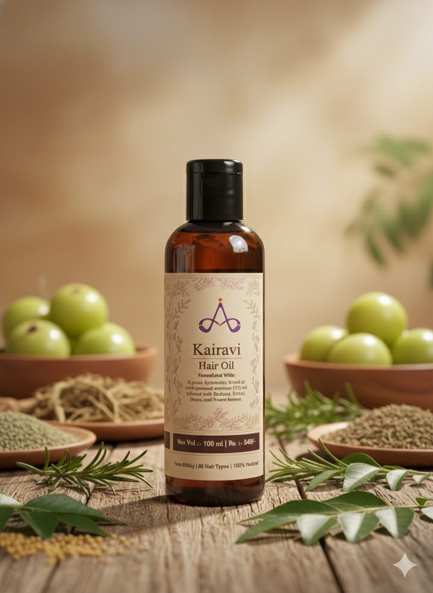 Kairavi Hair Oil is for those who understand that hair health is a reflection of scalp health and doshic balance, not marketing claims or silicone-based shine.